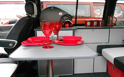 The cab passenger seat can swivel (extra) to give a third seat facing the bench seat across a removable island table.